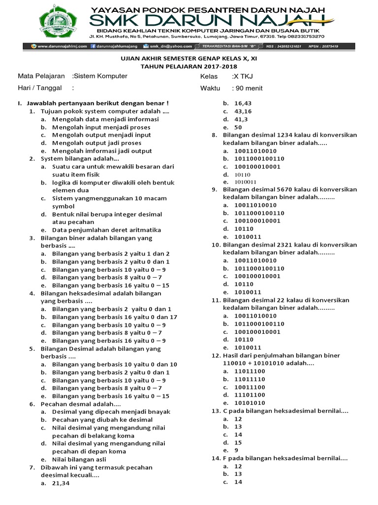 Soal uas biologi kelas x semester 2 dan kunci jawabanPosting pada biologi ipa umum ditag kumpulan soal biologi kelas 11 soal biologi kelas 11 dan jawabannya soal biologi kelas xi semester 2 sistem koordinasi soal biologi kelas xi semester 2 sistem pencernaan soal biologi kelas xi semester 2 sistem reproduksi soal ukk biologi kelas 11 semester 2 dan. Contoh soal tik sma dilengkapi dengan jawabannya ini merupakan kelanjutan dari soal tik sebelumnya yaitu soal tik kelas x sma semester 1 dan kunci jawaban oh ya bila anda mencari soal tik kelas xii bisa baca pada tulisan saya sebelumnya klik pada tulisan contoh soal tik kkpi ujian sekolah sma smk kelas xii. Bertanggung jawab bagaimana data dikonversi dan diformat untuk transfer data.